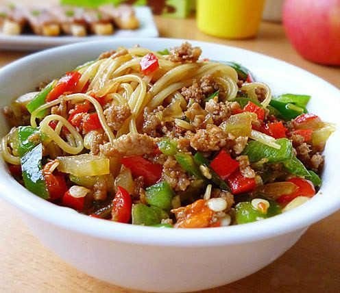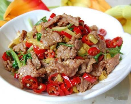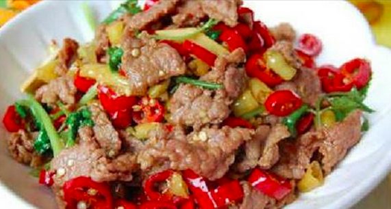 3、下油適量,趁油未熱放入牛肉旺火翻炒,燒至六成熟時,把火關小,加蓋燜至熟透。這樣炒出的牛肉既鮮美又嫩滑。