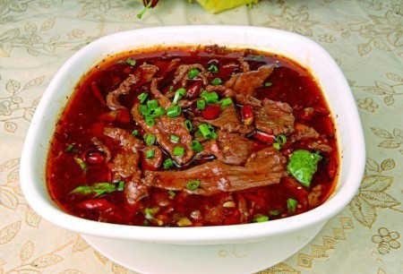 3、油鍋中放入豆瓣醬、花椒、蔥絲、蒜片、薑片煸香、加肉湯、醬油、精鹽、味精、白糖,胡椒粉燒沸放牛肉,弄好後放入青菜;