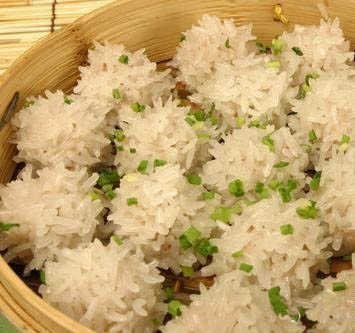 5、將肉餡搓成丸子,在糯米上滾上一層米;