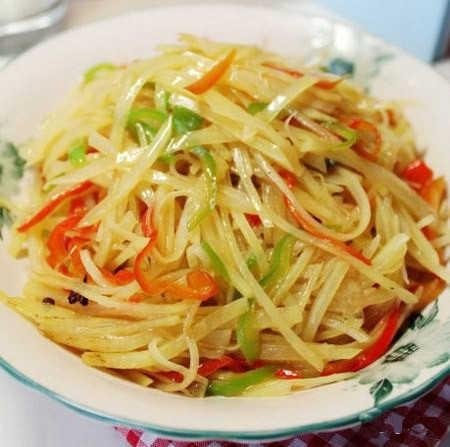 1、將土豆切成絲,放入盆中加入水泡泡;