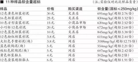 彩泥和黏土樣品,價格從3元到35元不等,一位業內人士表示,彩泥中的鋇元素有可能是添加了用於增加色彩度的化學合成物——立德粉,小朋友接觸這種物質可能會造成皮膚過敏、紅癢。