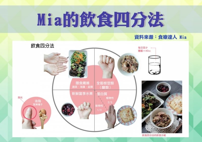 知名飲食達人Mia在健康2.0中現身說法,由於在學生時期,忙於念書與打工時常熬夜,造成日夜顛倒,再加上年輕時對於減重知識的缺乏,沒有好好打理自己的飲食菜單,還透過不健康的節食來控制胃口,造成生理期大亂,最後演變成早發性更年期報到,其他如失眠、憂鬱等身體的不適症狀等後遺症不斷,最後是在一次精神不濟的狀況下,出了一場車禍,讓她開始思考人生觀、積極的要扭轉這樣不健康的減肥方式。現在的Mia有一套「飲食四分法」,大方不藏私與大家分享,教導大家均衡攝取人體所需的營養素。