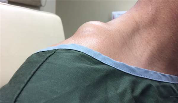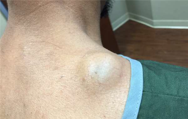 一旦沒了表皮遮蔽,可以清楚的看到皮膚裡巨大蛋型囊腫。
