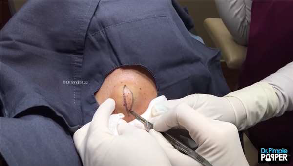 當桑德拉醫生在巨大囊腫上標記好切口的大小後,依舊保持著專業手法,拿著手術刀俐落的在患處切下表皮皮膚。