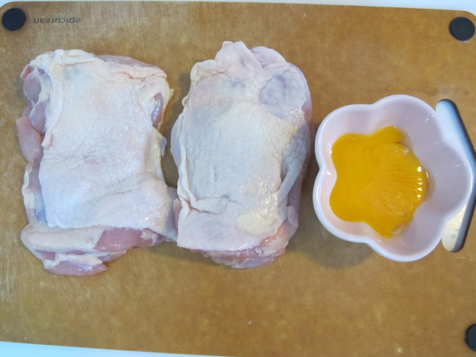 1. 雞髀扒去皮後切粒, 加蛋黃及調味料拌勻
