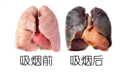吸煙前和吸煙後的對比圖!可以明顯的看到,吸煙後的肺已經顯黑色化!