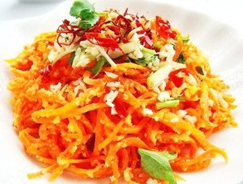 原料:胡蘿蔔1根、玉米面2小勺、油、鹽、味精、蔥、蒜、干辣椒、香菜