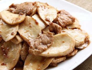 原料:杏鮑菇400克、豬肉200克、鹽、醬油2勺、蠔油1勺、澱粉1勺、白糖半勺、黑胡椒