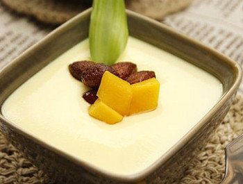 原料:土雞蛋2個、牛奶250毫升、杏仁10粒、芒果1個、白糖2湯匙