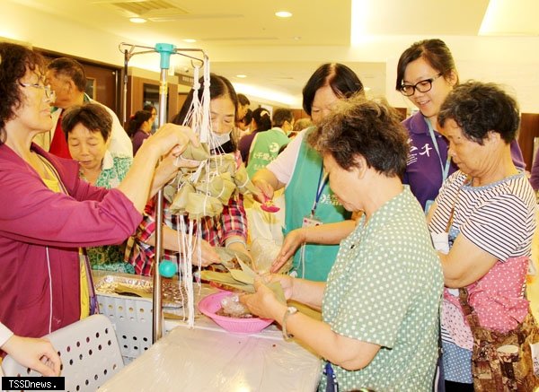 ▲苗栗市大千綜合醫院愛腦友團隊舉辦「粽香傳情」活動,病友包粽子當復健。(記者江乾松攝)