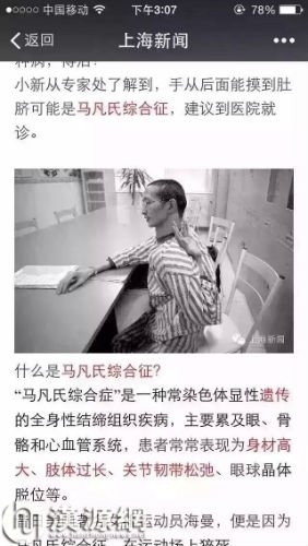“馬凡氏綜合症”是一種常染色體顯性遺傳的全身性結締組織疾病,主要累及眼、骨骼和心血管系統,患者常常表現為身材高大、肢體過長、關節韌帶鬆弛、眼球晶體脫位等。