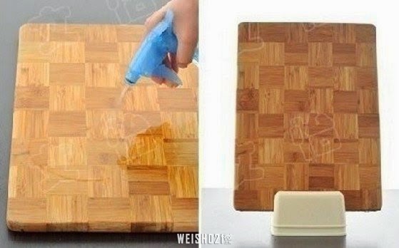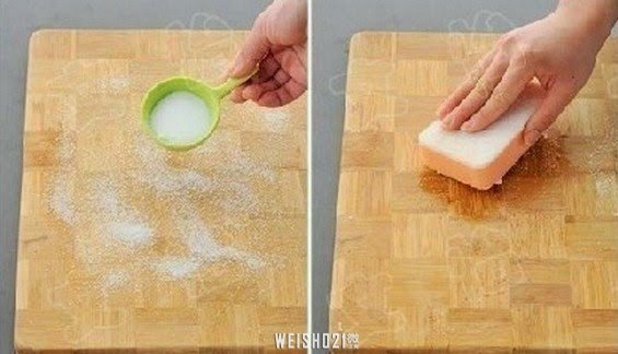 ▌先用洗潔精和清水把案板清洗乾淨,然後在案板上撒一勺鹽,用洗碗海綿蘸一點點水後,反覆擦拭案板的表面,然後用冷水沖洗乾淨。再將白醋和水以1:2的比例調好後倒入噴壺中,噴在案板的表面,然後放到通風的地方,自然風乾即可。
