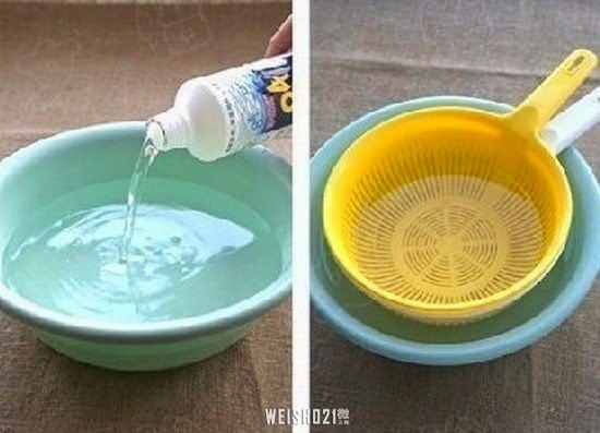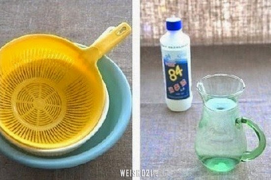▌將84消毒液和清水,以1:200的比例兌在一起,將需要「換膚」的塑料制品放入,浸泡兩個小時。再用清水反覆沖洗乾淨就可以了,效果好又不會產生任何腐蝕作用,浸泡過塑料框的水還可以倒入馬桶中,還能起到清潔馬桶的作用。