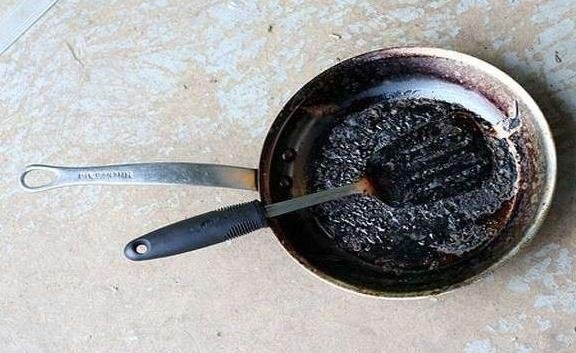 在那黑漆漆的鍋子裡倒入一杯白醋,然後放在爐子上加熱。滾了就把火關了,並參加一湯匙的小蘇打粉。浸泡一陣子後會變得很簡單清潔。