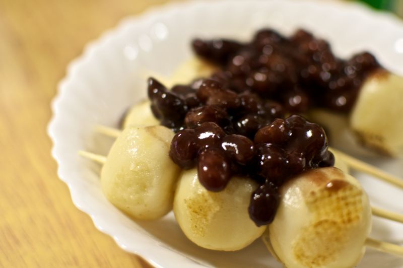 5用竹籤串成三粒一串,並放在平底鑊(可不放油或少量油)把團子四面煎至金黃即可。