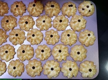 這種曲奇不需要焗至全塊金黃色或啡色,否則會太乾,正常曲奇大小焗製時唧花邊緣出現金黃色基本上已經可以出爐