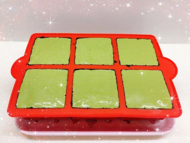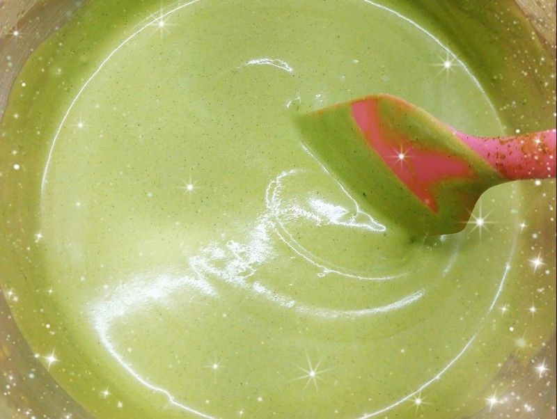 3慕絲層: 1. 魚膠粉加入鮮奶中(100 ml;拌勻後,靜置5分鐘,待魚膠粉完全吸水膨脹),用熱水坐溶(如直接用熱水開溶,魚膠粉會容易結塊),攪拌至魚膠粉完全溶解 2. 鮮奶(190 ml)用微波爐加熱10秒至微暖,再加入綠茶粉,攪伴至完全溶解,放涼,備用
