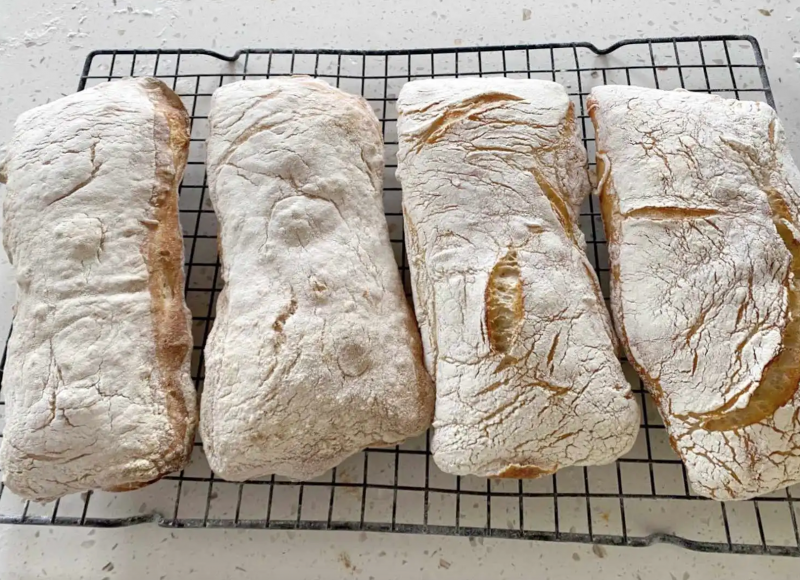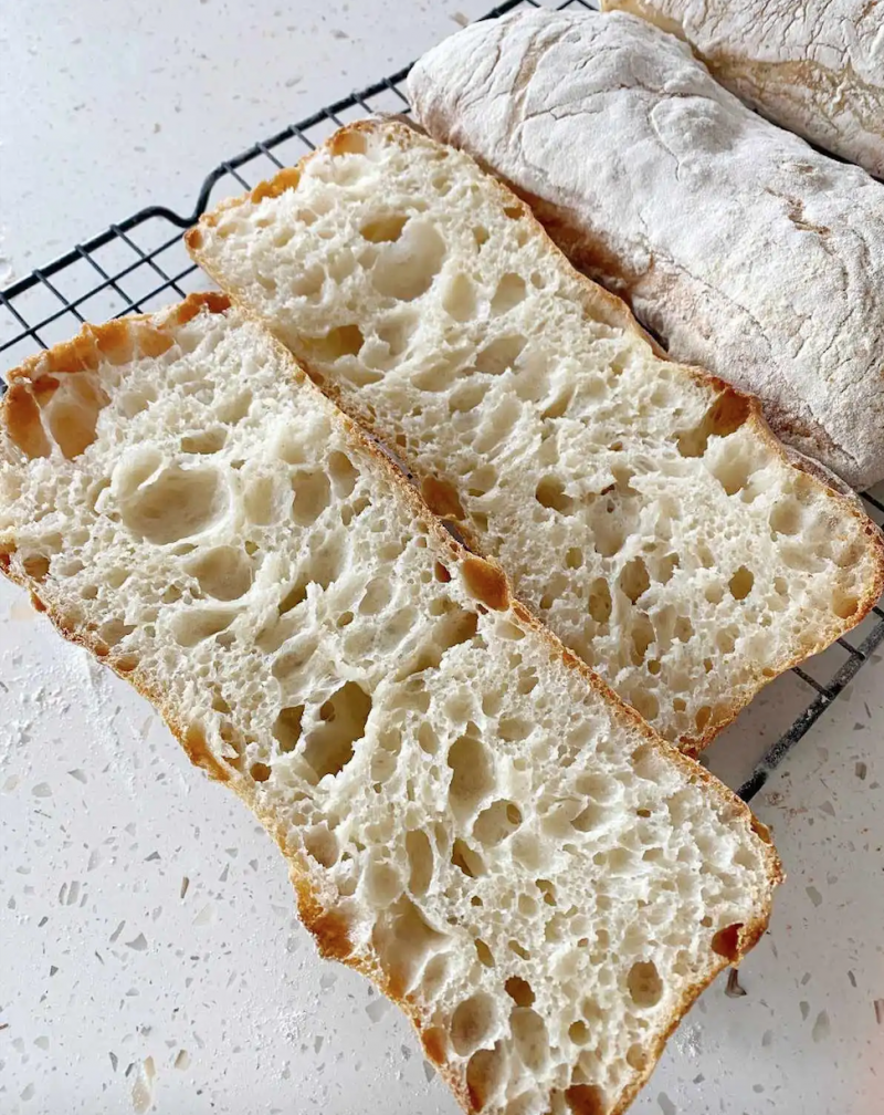 意大利的拖鞋麵包 – Ciabatta,因形狀長長像拖鞋而有此名。這個是水份非常高的麵糰,做出來的麵包內有很多大大小小的氣孔。外脆內鬆軟,非常好味!