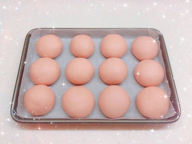 41. 撒少許麵粉在揉面墊上,輕壓粉團排氣(搓出粉團內的氣泡) 2. 將粉團分割成12等份(大概22 g;每份重量必需相同),滾圓,收口捏緊向下(避免發酵和焗時散開) 3. 然後將12個已滾圓的粉團排好(粉團與粉團之間必需留有空隙),放進長方型烤盤內(塗上油),蓋上保鮮紙,再靜置10分鐘