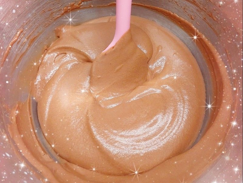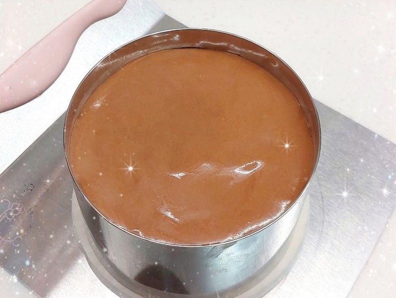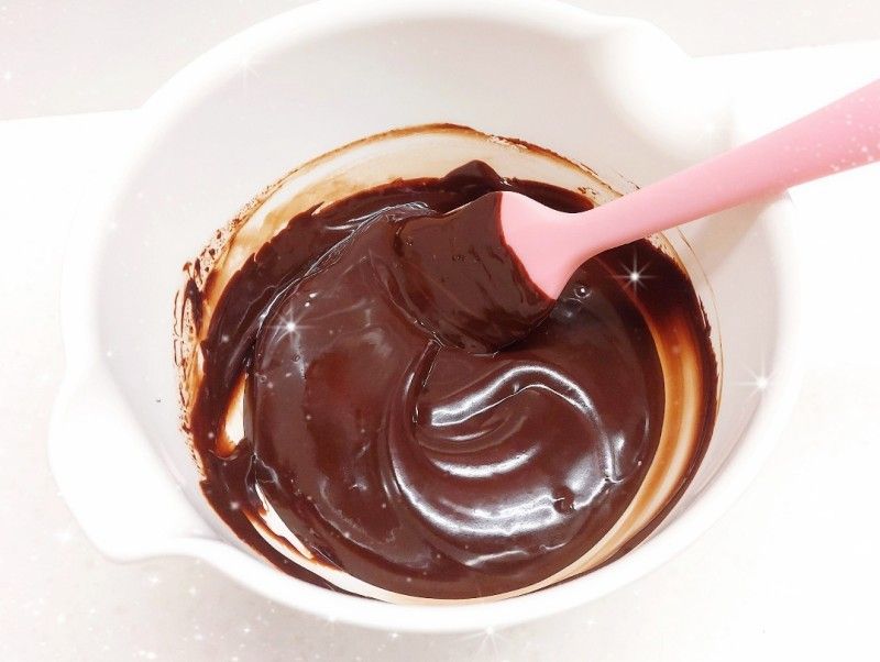 61. 將牛奶朱古力和黑朱古力用熱水坐溶(亦可用微波爐加熱1.5分鐘成朱古力醬;朱古力加熱不可超過50°,否則會變質而失去光澤) 2. 鮮奶(52 ml)用微波爐加熱10秒至微暖,加入朱古力醬,拌勻至朱古力滑身(呈令面),備用