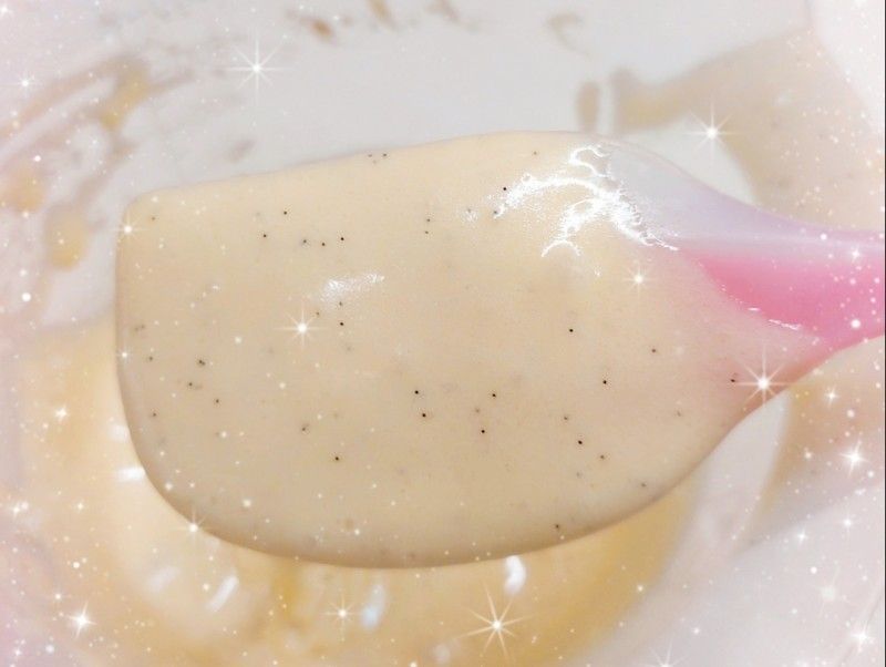 11. 先將雲尼拿籽/香草籽(需用刀子打直剖開雲尼拿條/香草莢後刮出雲呢拿籽/香草籽)加入牛油(牛油先用熱水坐溶/用微波爐加熱至溶化成牛油溶液),充分拌勻,備用