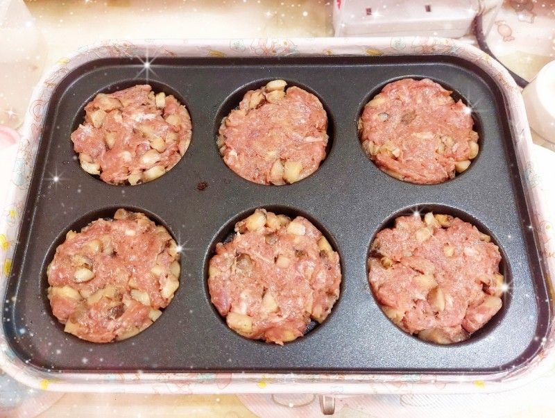 肉餅我用攪拌機打成碎肉,然後用廚師機加冬菇同調味料打到起膠,放雪櫃冷藏20分鐘,就可以煎架喇!!
