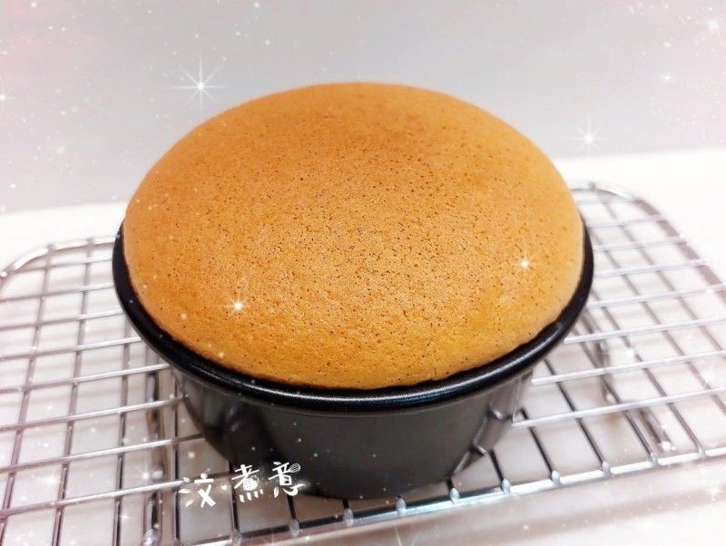 51. 完成後,先將蛋糕模在已墊枱布的桌面上(距離桌面大概10 cm)輕摔兩下(使熱氣散走,防回縮),然後馬上倒扣放在物件上(如不倒扣會回縮,中間一定會凹下去,無法撐起,倒扣是利用地心吸力的幫助,維持整個蛋糕該有的高度和形狀) 2. 放涼至蛋糕完全冷卻後,即可脫模(完全冷卻的蛋糕才可以定型;成功的狀態是放涼後沒回縮,沒凹底)