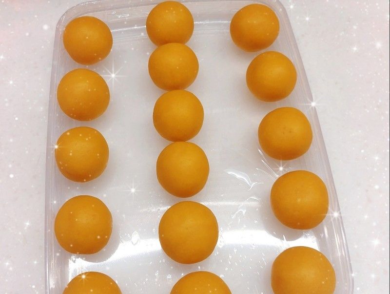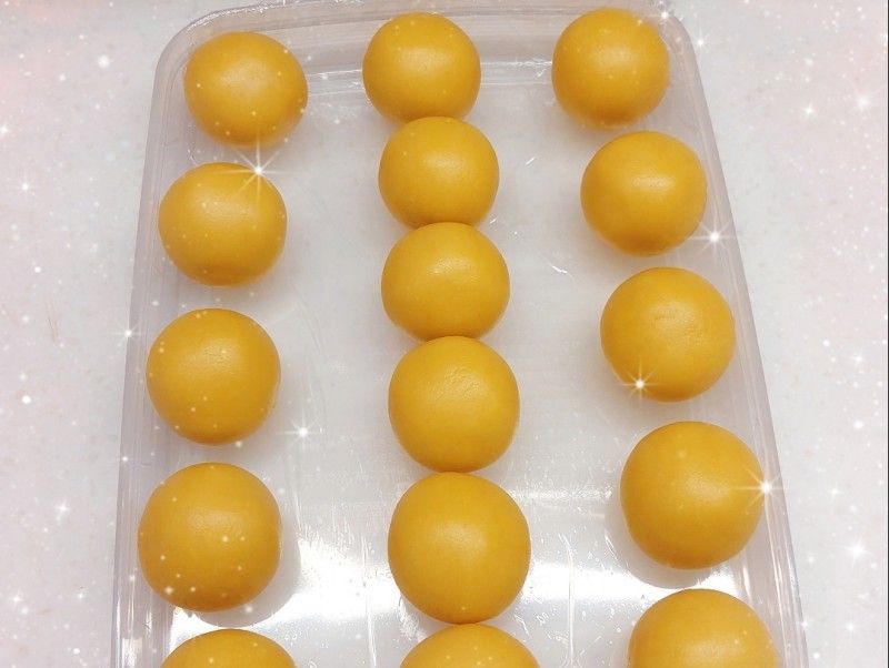 41. 將奶黃餡(24 g)壓平(奶黃餡需放室溫回溫至略軟身),再放入已結凍的流心奶黃餡(6 g;不要一次將全部的取出,做幾個取幾個,否則已結凍的流心奶黃餡很快解凍,軟化後不好包餡),包好,搓圓,放進冰格冷凍1小時(較容易包入),備用