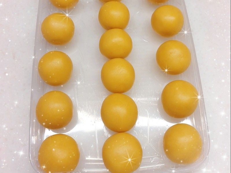 41. 將奶黃餡(24 g)壓平(奶黃餡需放室溫回溫至略軟身),然後放入已結凍的流心奶黃餡(6 g;不要一次將全部的取出,做幾個取幾個,否則已結凍的流心奶黃餡很快解凍,軟化後不好包餡),包好,搓圓,放進冰格冷凍30分鐘(較容易包入),備用