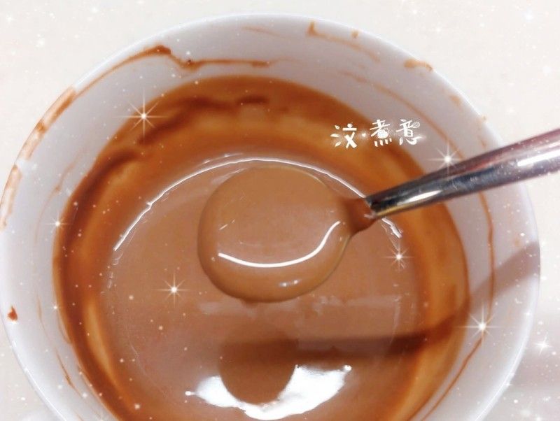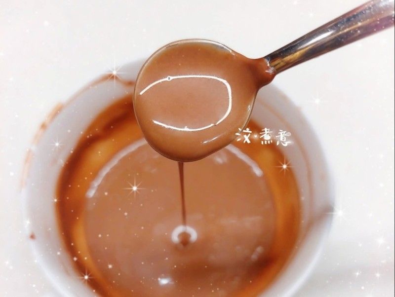 21. 將黑朱古力用熱水坐溶(亦可用微波爐加熱1.5分鐘成朱古力醬;朱古力加熱不可超過50°,否則會變質而失去光澤) 2. 鮮奶和淡忌廉混合,再用微波爐加熱10秒至微暖,加入黑朱古力醬,拌勻至黑朱古力滑身(呈令面)