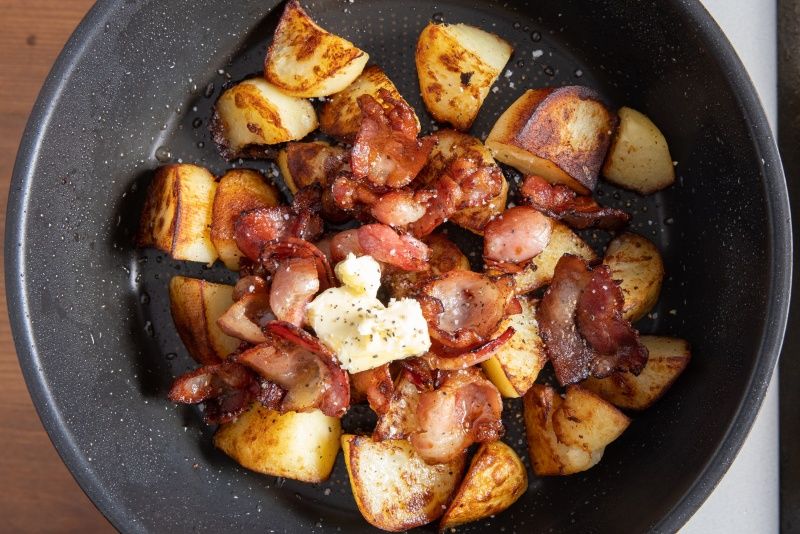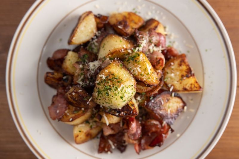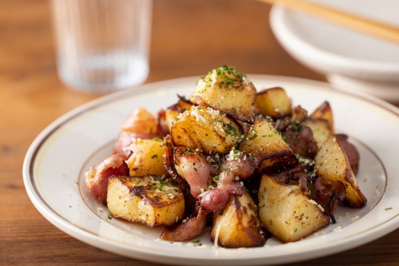 這道料理有種日式居酒屋或是和風洋食的風格在裏頭,雖然食材只有簡單的馬鈴薯與培根,