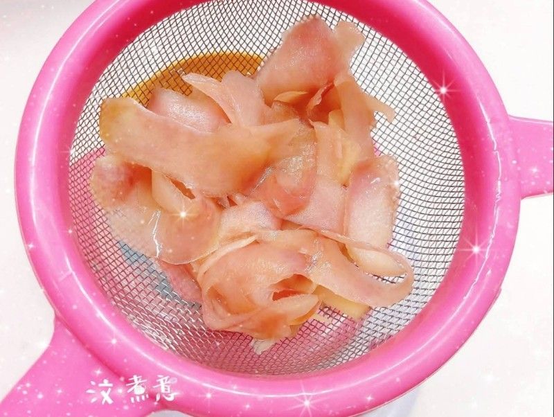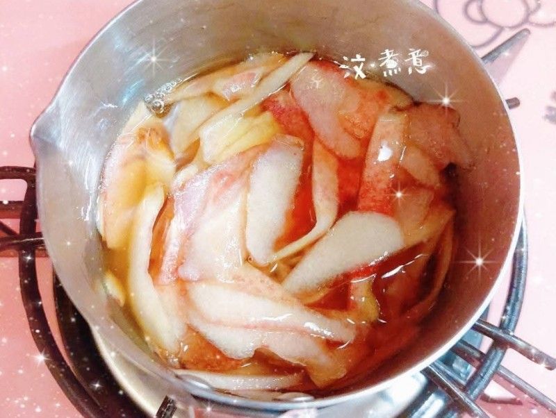 11. 水蜜桃洗淨,去除表面絨毛(先把水蜜桃加入梳打水中※注意※梳打粉和水的比例1:500;浸泡約3分鐘,輕輕搓洗,絨毛會自動浮起/把水蜜桃加入鹽水中,浸泡約3-5分鐘,再用軟毛刷輕輕將絨毛去除),去皮、去核、起肉(水蜜桃果肉約320 g切成水蜜桃粒,水蜜桃皮約40-45 g)
