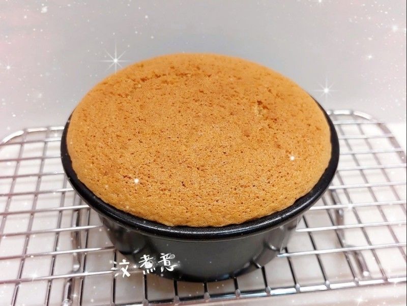 51. 完成後,先將蛋糕模在已墊枱布的桌面上(距離桌面大概10 cm)輕摔兩下(使熱氣散走,防回縮),然後馬上倒扣放在物件上(如不倒扣會回縮,中間一定會凹下去,無法撐起,倒扣是利用地心吸力的幫助,維持整個蛋糕該有的高度和形狀) 2. 放涼至蛋糕完全冷卻後,即可脫模(完全冷卻的蛋糕才可以定型;成功的狀態是放涼後沒回縮,沒凹底)