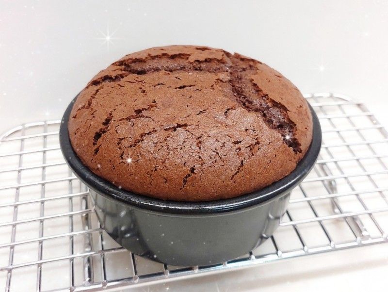 81. 完成後,先將蛋糕模在已墊枱布的桌面上(距離桌面大概10 cm)輕摔兩下(使熱氣散走,防回縮),然後馬上倒扣放在物件上(如不倒扣會回縮,中間一定會凹下去,無法撐起,倒扣是利用地心吸力的幫助,維持整個蛋糕該有的高度和形狀) 2. 放涼至蛋糕完全冷卻後,即可脫模(完全冷卻的蛋糕才可以定型;成功的狀態是放涼後沒回縮,沒凹底)