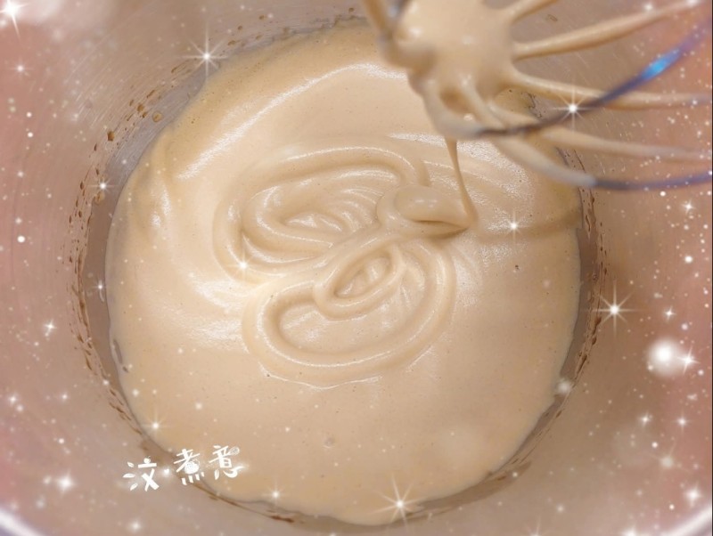 21. 將蛋用溫熱水(大概50°)浸泡10分鐘(水溫不可超過50°,以免雞蛋燙熟),再加入黑糖,用電動打蛋器以「5-6 檔」打至呈忌廉狀(呈現有紋路的狀態,如糊狀般質地細緻有光澤;拿起打蛋器不易滴落,畫出的花紋亦不會很快消失;打發時間約3.5分鐘) 2. 然後慢慢減速至停止(有助將大氣泡變成質地細膩的小氣泡;打發完成的狀態是細膩而有光澤;時間約2分鐘)