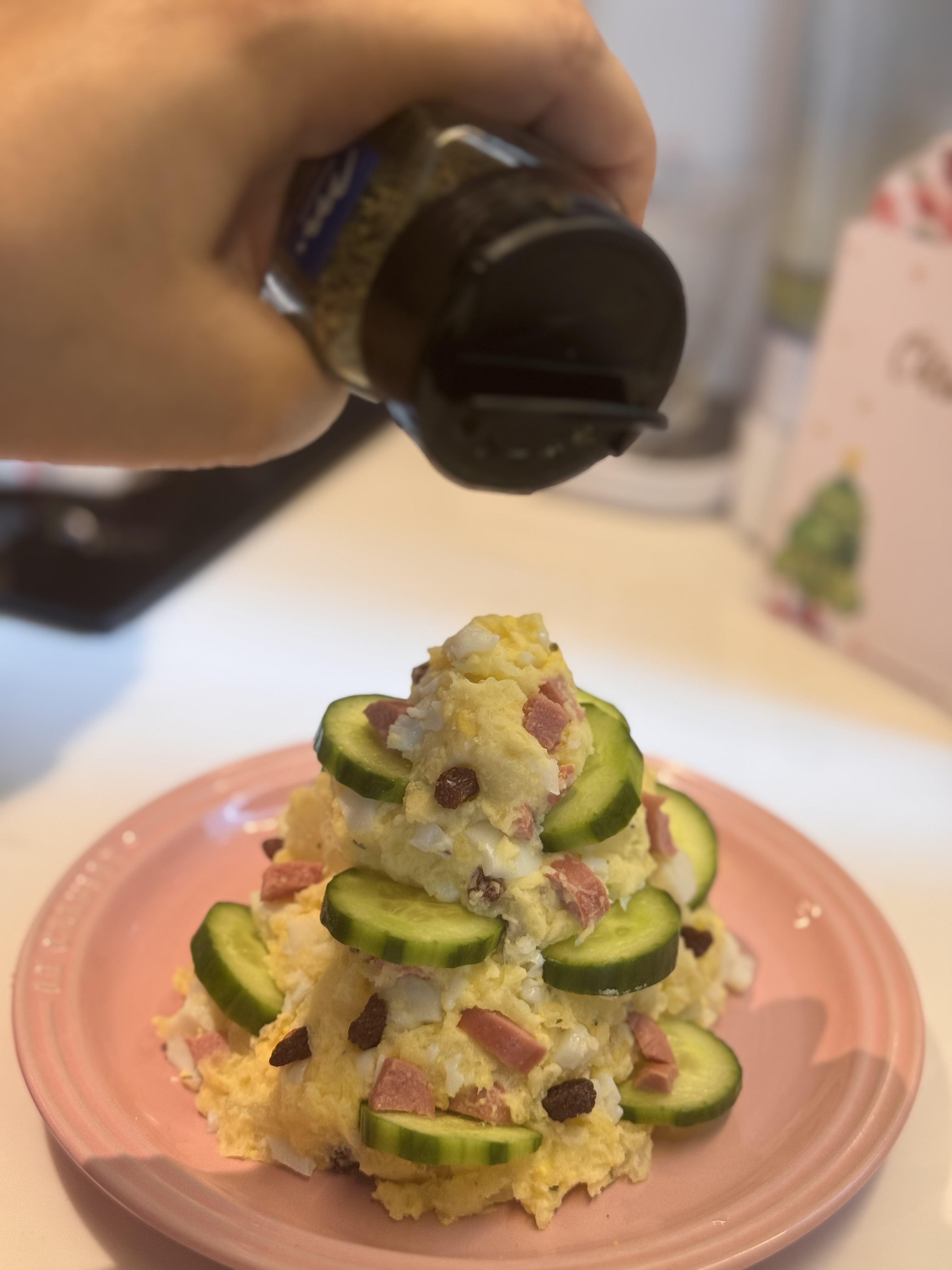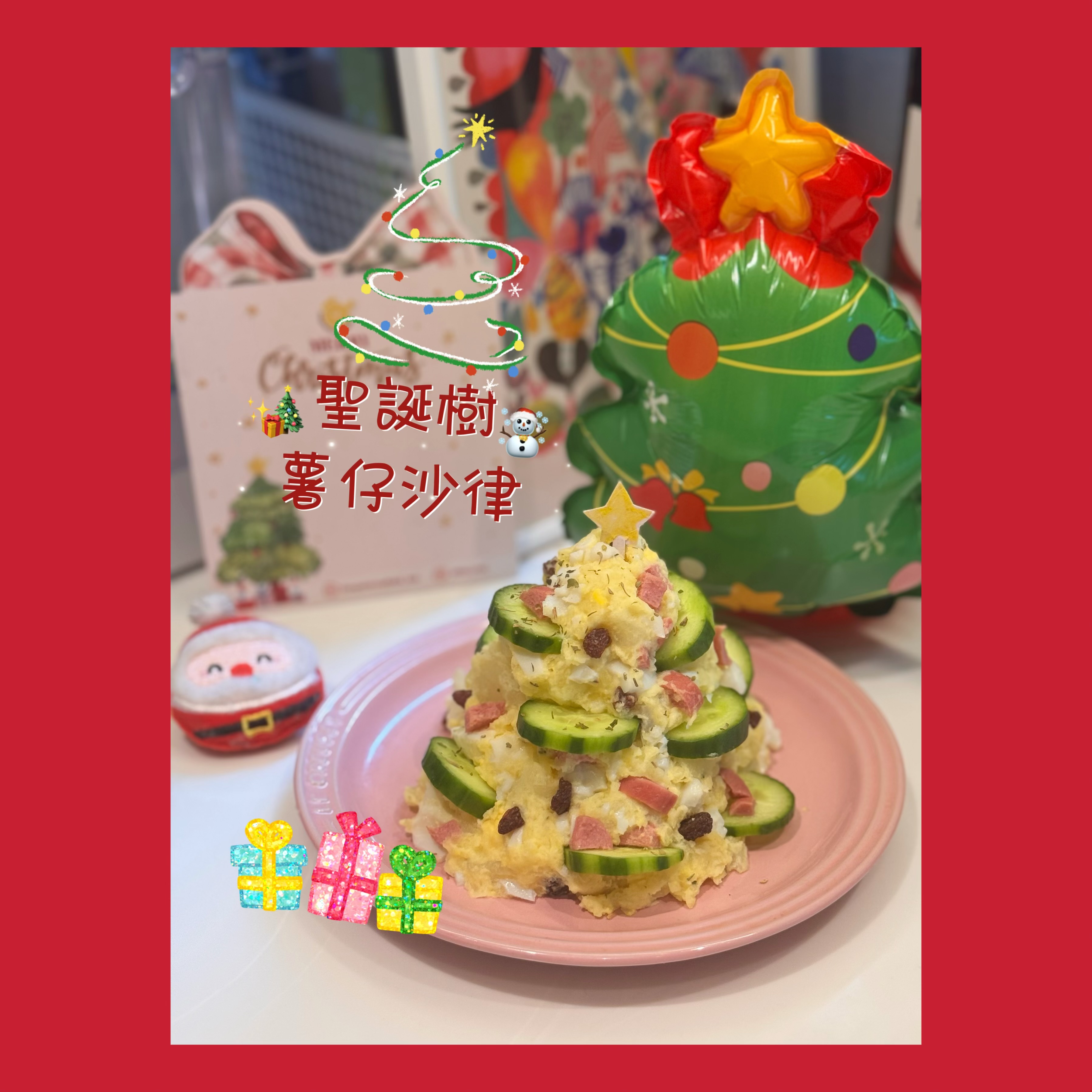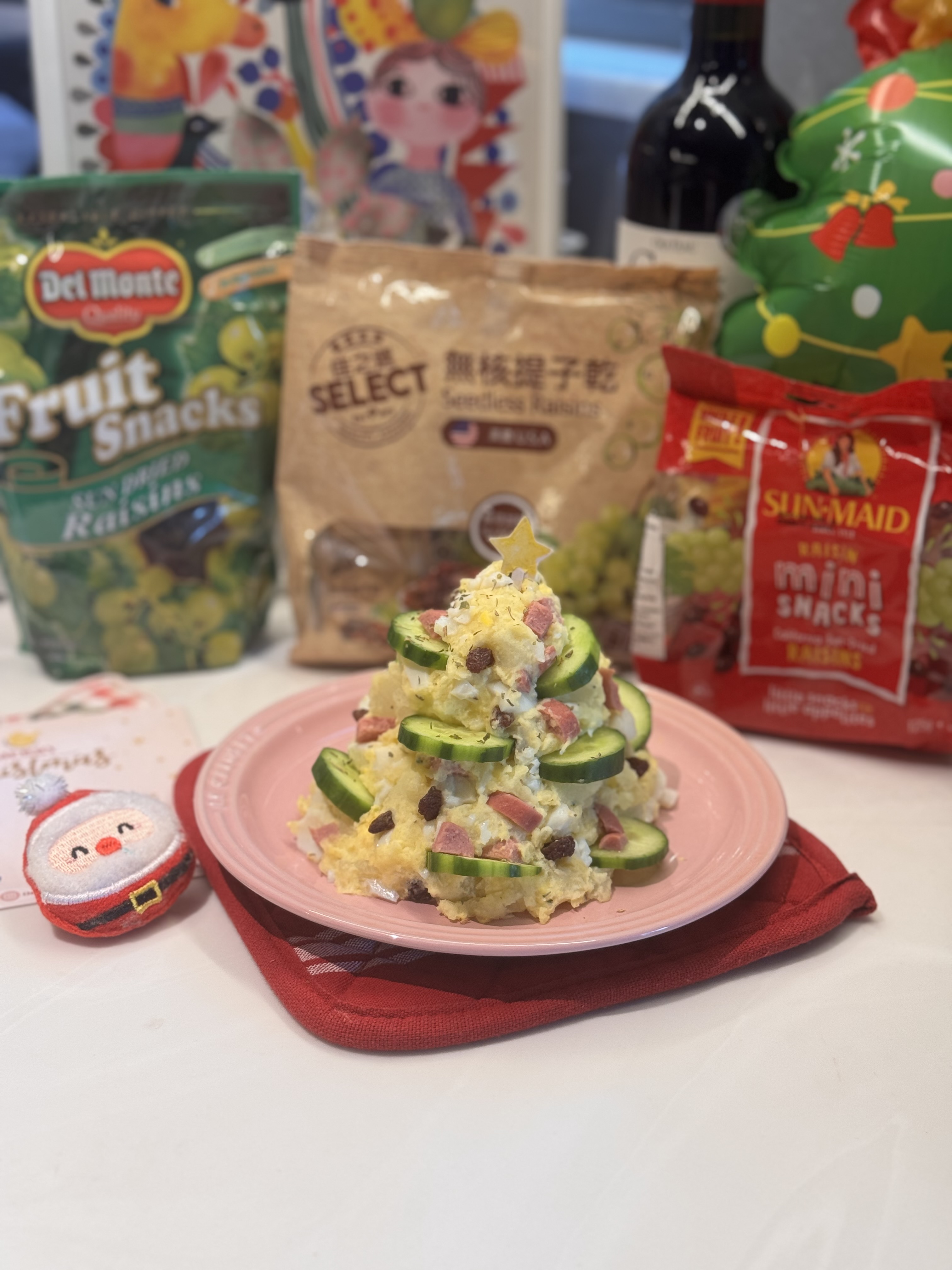 要煮得材料就我準備,細佬就幫手搣蛋殼、攪拌好薯仔沙律、幫手裝飾聖誕樹(放上青瓜片、腸仔粒、提子乾),最後加上星星🌟 完成✅ 我特別推介大家加埋提子乾, 含豐富營養價值,也帶天然甜味,配上薯仔沙律🥗好夾又加添更多營養!記得去各大超市買美國加州的提子乾呀!