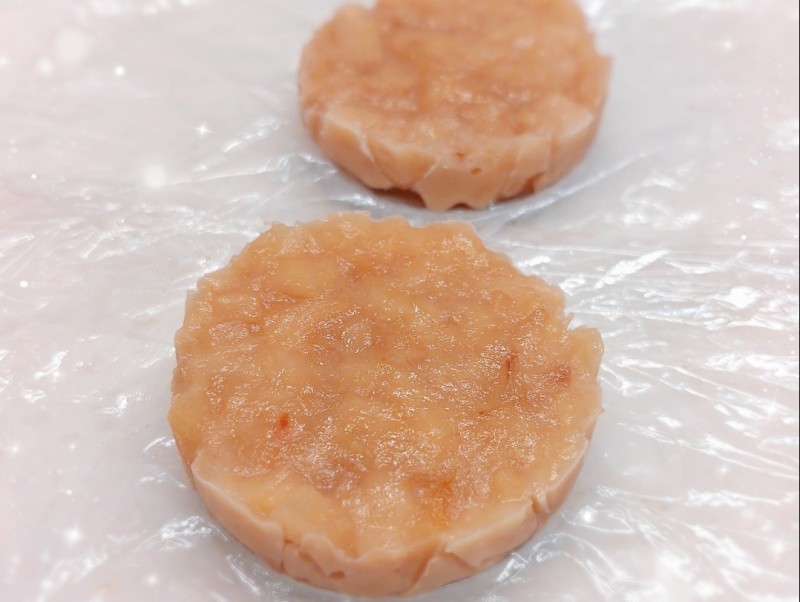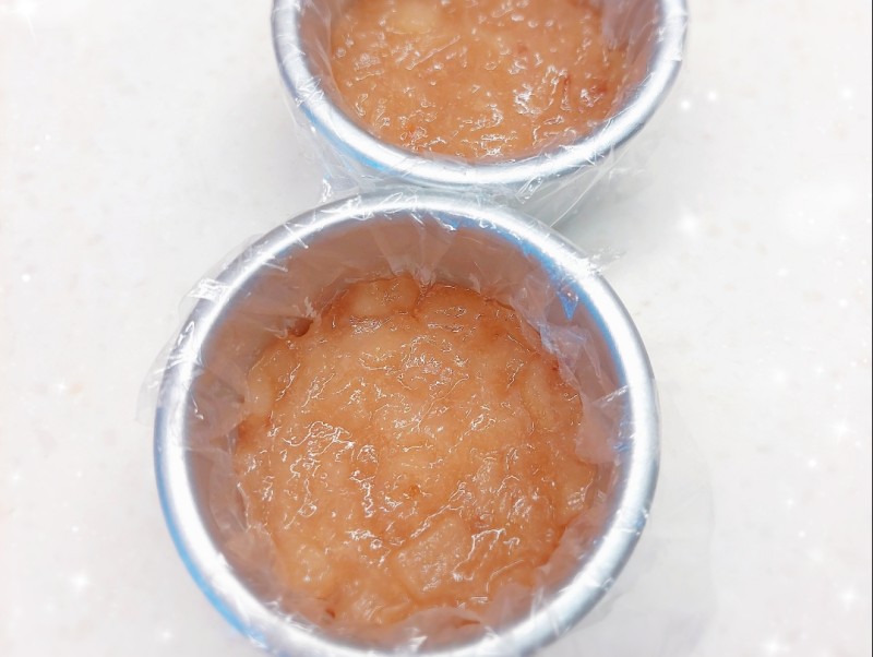 4果醬流心餡: 1. 果醬倒入模具中(先舖上保鮮紙;模具需比蛋糕模小1.5倍;如果醬太濃稠,可加水煮沸稀釋;果醬和水的比例1:0.2-0.25※注意※視果醬的濃稠度而定;用小火煮至混合和稍微濃稠;邊煮邊攪拌),放進冰格冷凍,備用