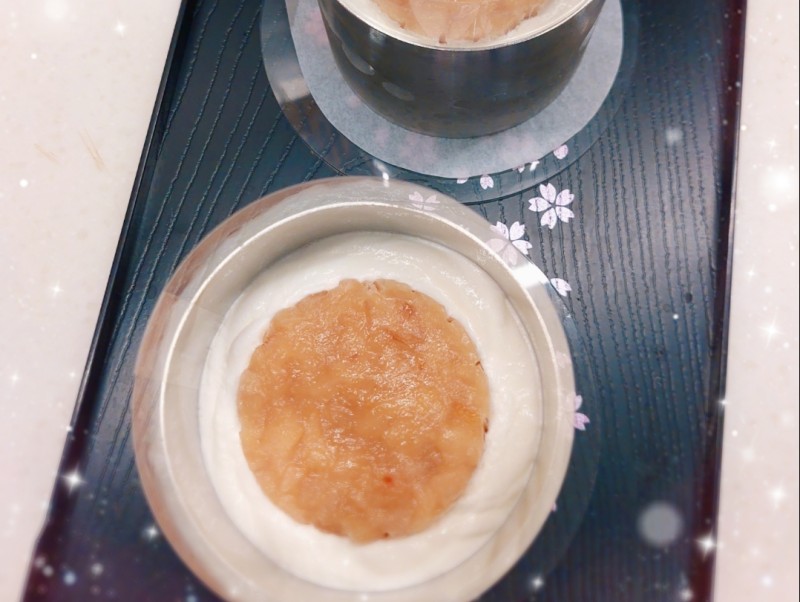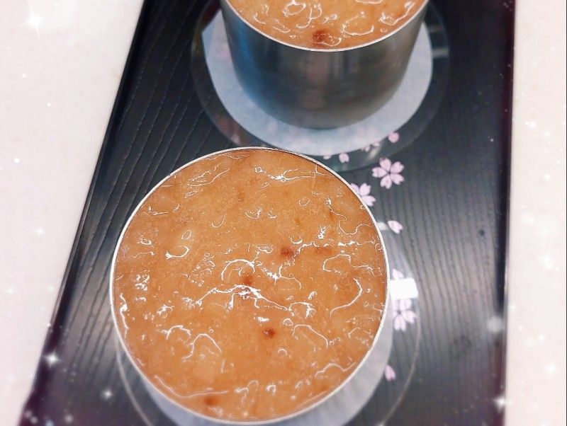 11水蜜桃果醬啫喱: 1. 魚膠粉加入水中(拌勻後,靜置5分鐘,待魚膠粉完全吸水膨脹),用熱水坐溶(如直接用熱水開溶,魚膠粉會容易結塊),攪拌至魚膠粉完全溶解 2. 加入水蜜桃果醬,拌勻成水蜜桃果醬啫喱 3. 然後倒在已凝固的牛奶慕絲上,放進雪櫃冷藏至凝固