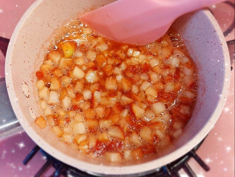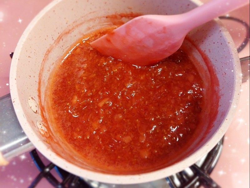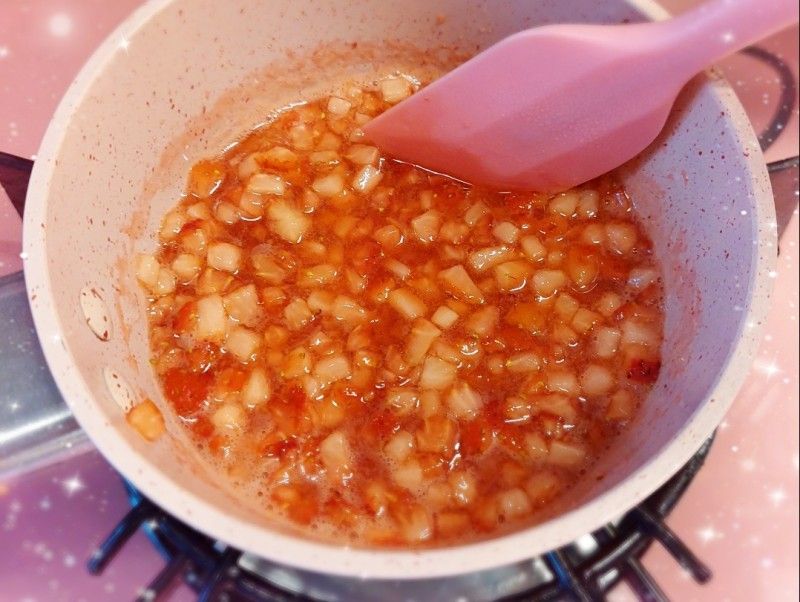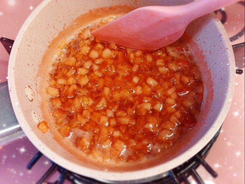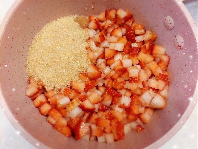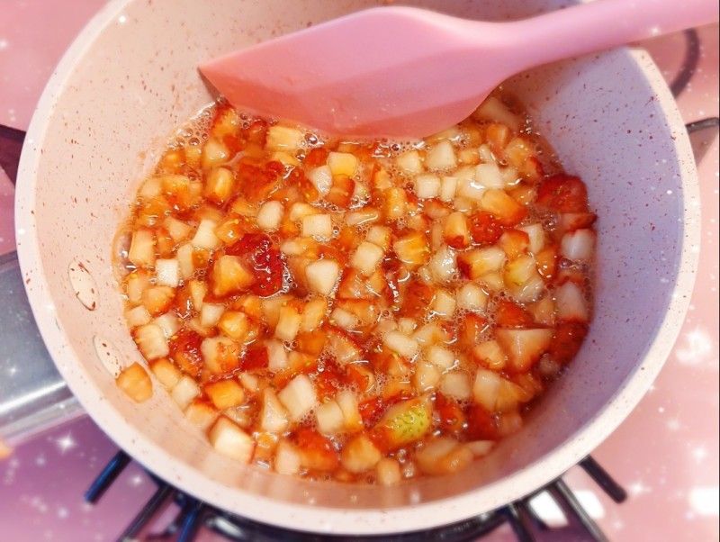 我今次想士多啤梨果醬流心餡的口感保留到顆粒果肉,所以唔需要打成果蓉,只需要將士多啤梨切小粒,加少少糖同檸檬汁,用小火煮至濃稠就完成✌️✌️
