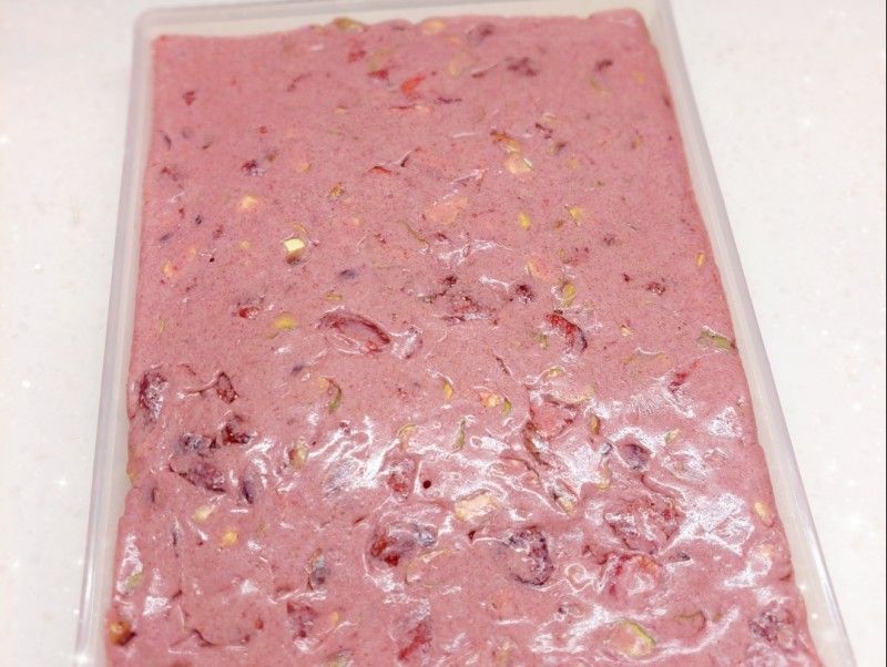 31. 加入已烤焗的開心果和凍乾士多啤梨,拌勻後即離火(宜快速將材料混合,時間越長越難攪拌,棉花糖亦容易焦黑) 2. 將鳥結糖漿倒在模具上,攤平壓實至適當的厚度