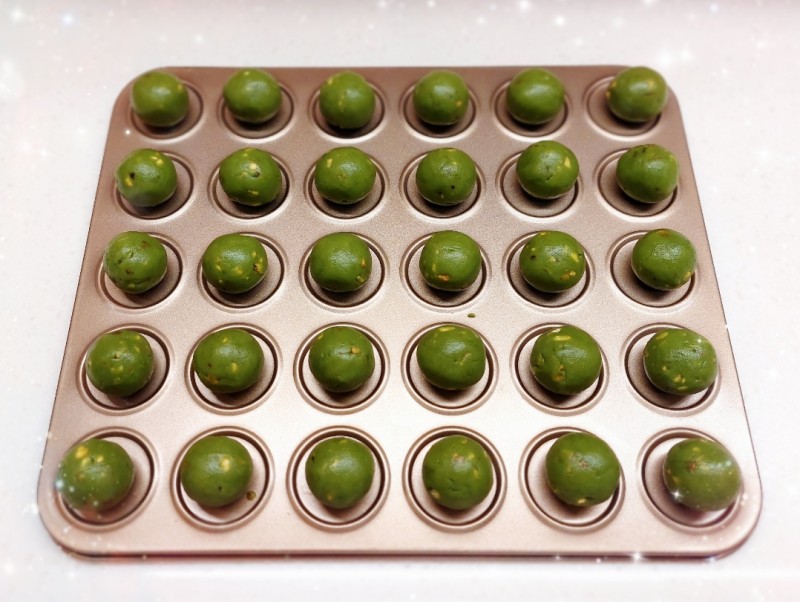 31. 將粉團分成一份份(12 g),搓圓,再略為壓扁(不可太扁,焗出來會太薄的),然後塗上一層蛋白液,再灑上少許開心果碎裝飾
