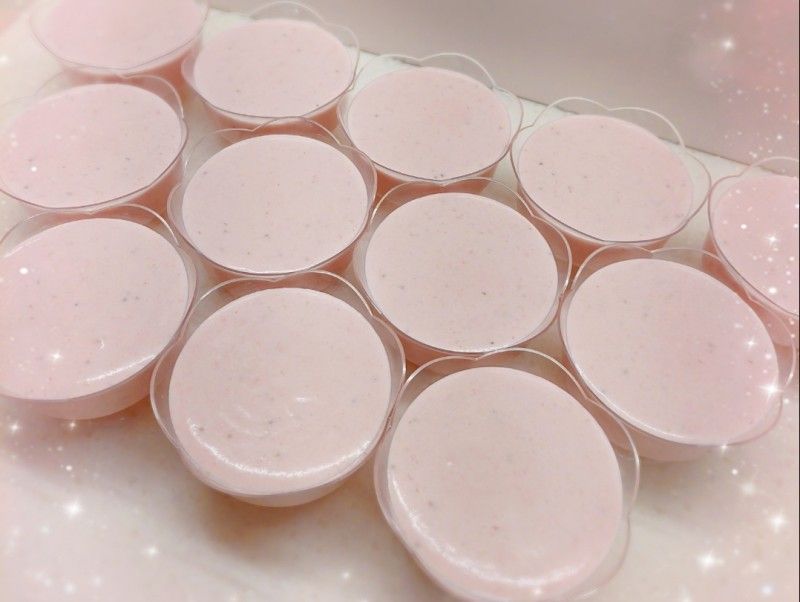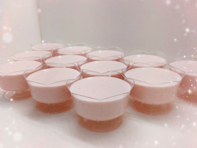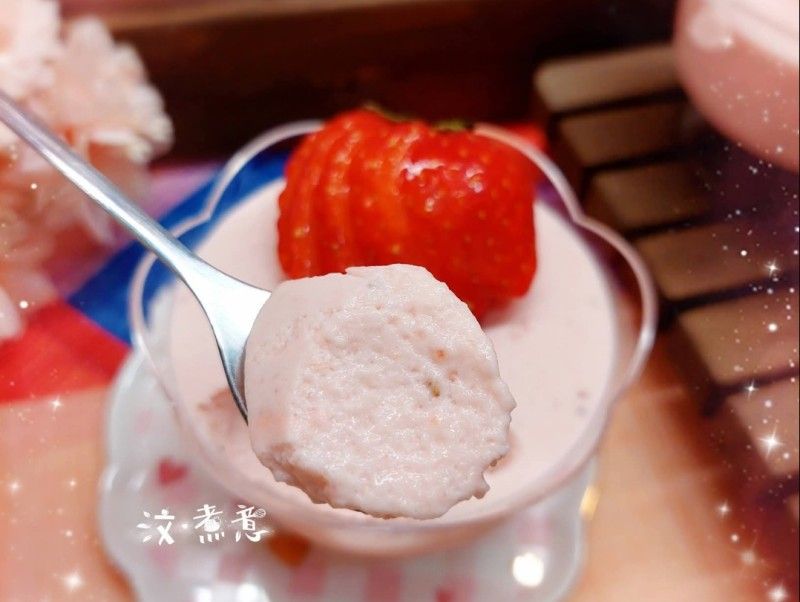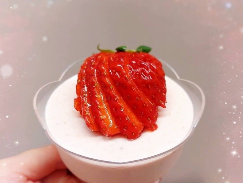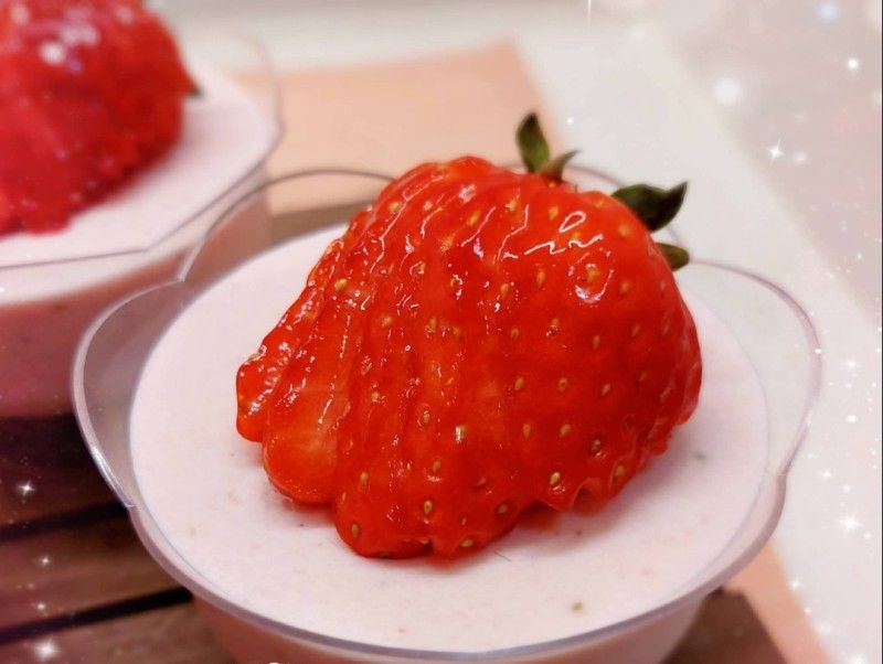 21. 將士多啤梨(40粒※去蒂450 g)洗淨,用攪拌機打成士多啤梨茸,放進雪櫃冷藏,備用 2. 將鮮奶(80 ml)用微波爐加熱20秒至微暖 3. 加入已溶解的魚膠粉,攪拌至完全均勻